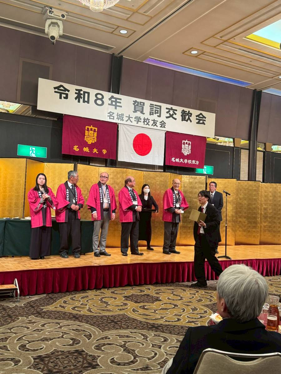 名古屋栄の名古屋ガーデンパレスホテルにて、校友会主催「令和8年度の賀詞交歓会」が開催されました。今年は名城大学開学100周年そのプレイベントともなるため、200名以上が一同に集まり、OBと学生が一緒になり、演奏・合唱・応援団(リダー部、吹奏楽部、チアリーダー部)と多数の催しで、大変盛り上がりました。交通機械会からは、3名の役員が参加して、新理事長である小原先生と記念撮影をとることができました。